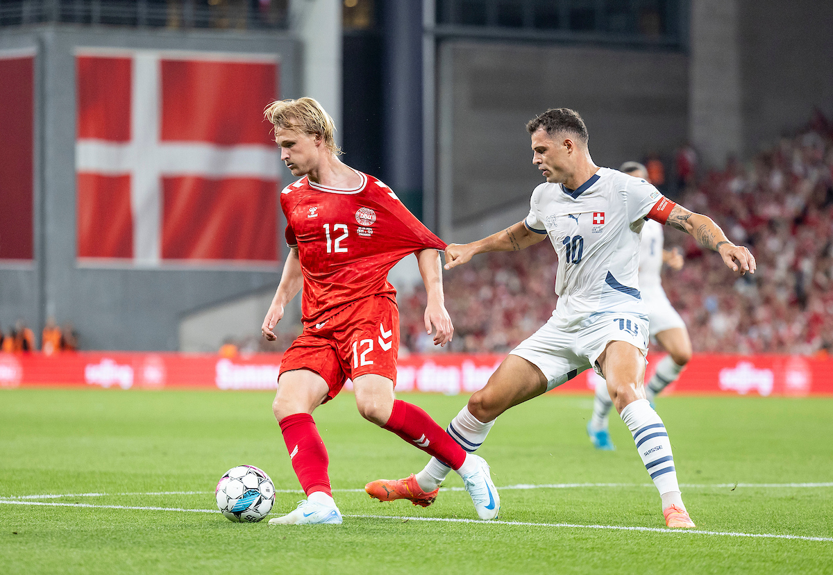 Pierre-Emile Højbjerg har scoret til 2-0 i septembers møde med Schweiz i Parken. Foto: fodboldbilleder.dk