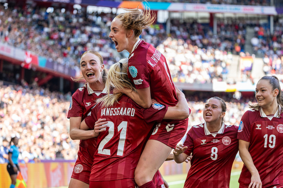 Danskerne viste sig dog også farlige på hurtige kontraktstød i første halvleg, men det var efter et hjørnespark, at de danske underdogs fik tysset tyskerne. Efter et opportunistisk løb af Janni Thomsen endte bolden pludselig hos Amalie Vangsgaard, der køligt bankede bolden i nettet med højrefoden. 1-0 til Danmark efter 25 minutters spil.