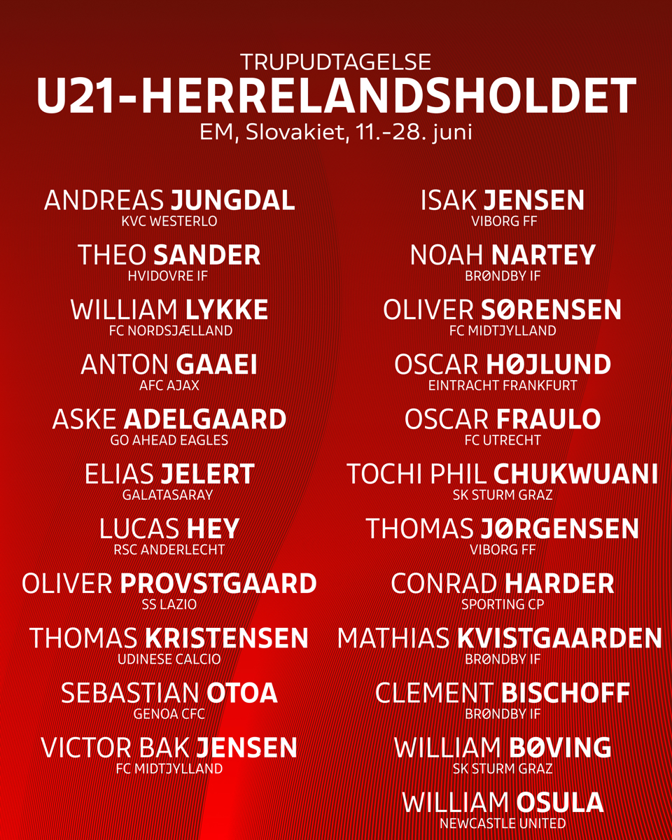 Matias Kvistgaarden og Anton Gaaei blev mandag udtaget til Herrelandsholdet, men støder til U21-holdet senere. Resten af truppen samles til en kortere precamp i Vejle forud for afrejsen til Slovakiet.