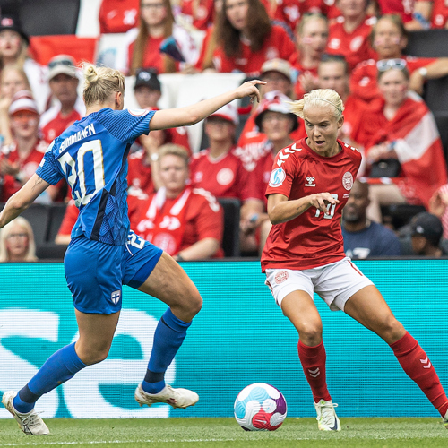 Pernille Harder i aktion mod Finland ved EM 2022. Foto: fodboldbilleder.dk